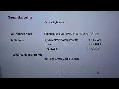 Sitten virkarikoksiin kunnostautui vielä Valvira ja Aluehallintovirasto. Olin jo tuossa vaiheessa myös kannellut tästä 2011 huhtikuussa Helsingin hovioikeudelle. Mutta nyt viimein Helsingin käräjäoikeudesta sain tällaisen viestin 20.10.2025, jossa väitettiin siviilikanne hakemuksen olevan sekava ja siitä kuulemma puuttui jotain kohtia, joten minulle sitten annettiin täydennyskehoitus ja sanottiin, että minulla olisi toimitettava viimeistään 20.11.2025 nämä täydennykset, mutta eilen sitten sain 30.10.2025 sähköpostiini kaksi asiakirjaa, joissa toinen oli Helsingin käräjäoikeudelta 620,00 euron lasku, joka oli tämän käräjätuomari Marko Lepistön Tuomiolauselma kanne hylätään.